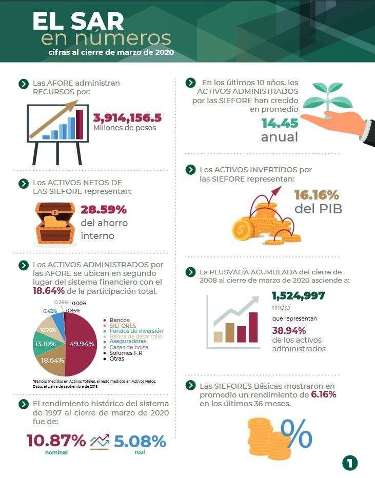 La principal fuente de ahorro y financiamiento en el país, son las AFORES, al cierre de marzo de 2020, sus recursos eran de 3,914,156,500,000 millones de pesos. Equivalentes a 16.14% del PIB a pesos corrientes de la misma fecha el cual fue según datos del INEGI de 24,237,620,000,000 a pesos corrientes.